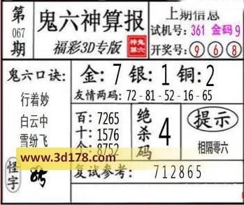3d第22067期鬼六神算报为您推荐鬼六口诀: