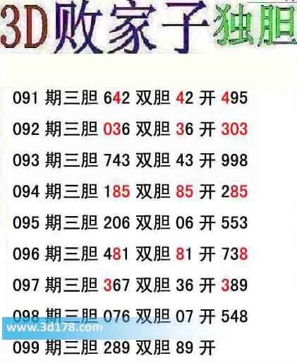 3d福彩3d之家第2014099期3d败家子独胆图: