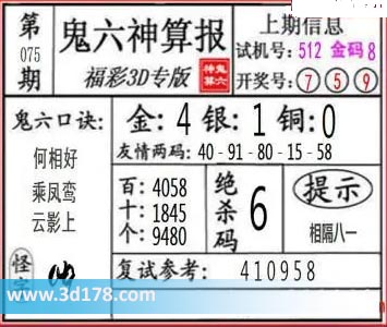 3d第22075期鬼六神算报为您推荐鬼六口诀: