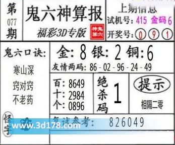 3d第22077期鬼六神算报为您推荐鬼六口诀: