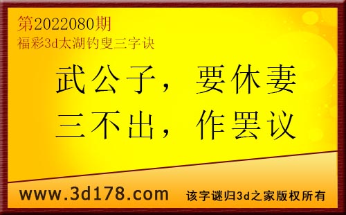 3d第22080期太湖字谜:武公子,要休妻,三不出,作罢议