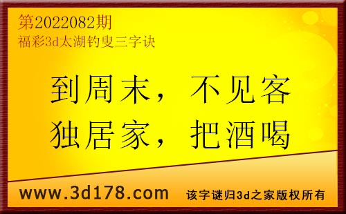 3d第22082期太湖字谜:到周末,不见客,独居家,把酒喝
