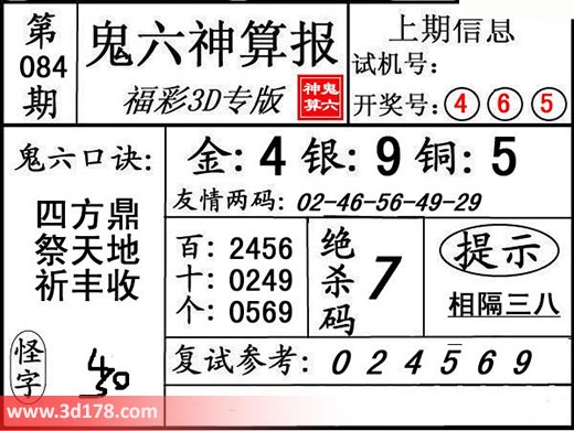 3d第22084期鬼六神算报为您推荐鬼六口诀: