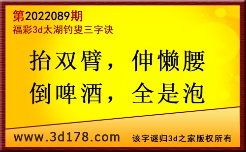 3d第22089期太湖字谜:抬双臂,伸懒腰,倒啤酒,全是泡