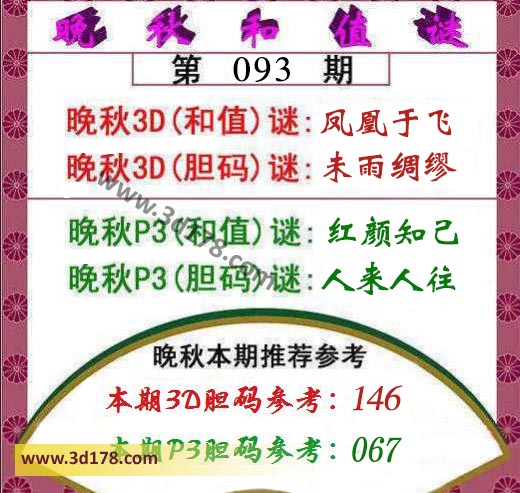 晚秋3D(和值)谜:凤凰于飞