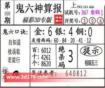 3d第22098期鬼六神算报为您推荐鬼六口诀: