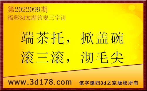 3d第22099期太湖字谜:端茶托,掀盖碗,滚三滚,沏毛尖