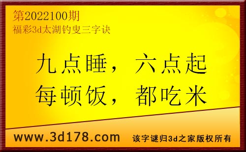 3d第22100期太湖字谜:九点睡,六点起,每顿饭,都吃米