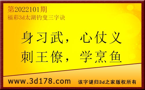 3d第22101期太湖字谜:身习武,心仗义,刺王僚,学烹鱼