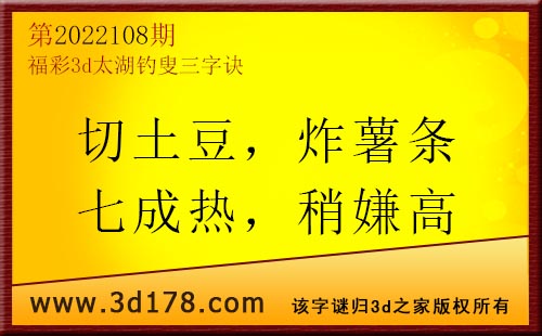 3d第22108期太湖字谜:切土豆,炸薯条,七成热,稍嫌高