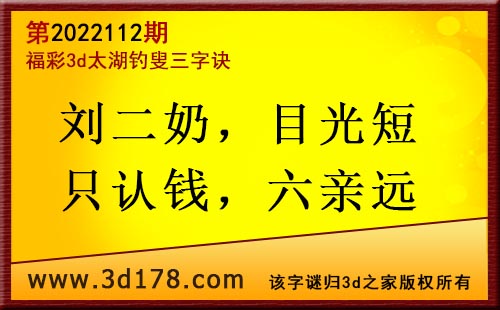 3d第22112期太湖字谜:刘二奶,目光短,只认钱,六亲远