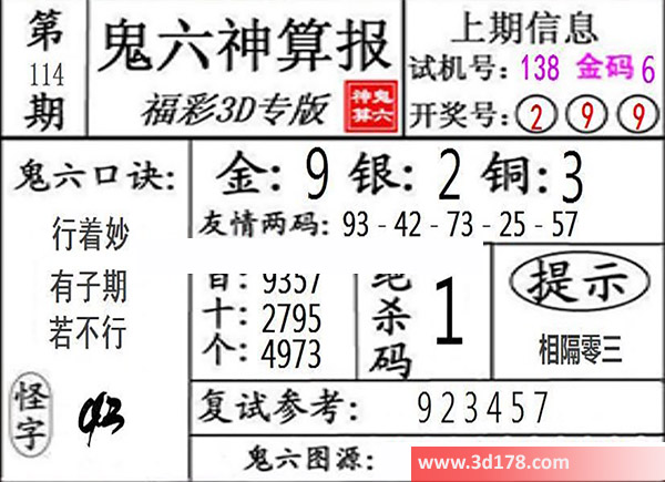 3d第22114期鬼六神算报为您推荐鬼六口诀: