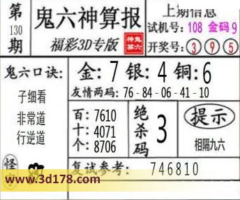 3d第22130期鬼六神算报为您推荐鬼六口诀: