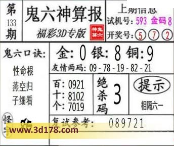 3d第22133期鬼六神算报为您推荐鬼六口诀: