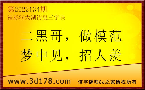 3d第22134期太湖字谜:二黑哥,做模范,梦中见,招人羡
