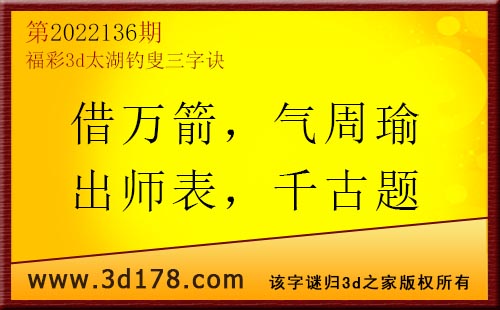 3d第22136期太湖字谜:借万箭,气周瑜,出师表,千古题