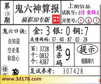 3d第22136期鬼六神算报为您推荐鬼六口诀: