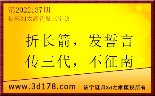 3d第22137期太湖字谜:折长箭,发誓言,传三代,不征南