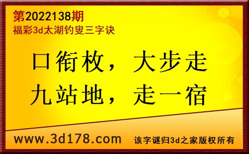 3d第22138期太湖字谜:口衔枚,大步走,九站地,走一宿