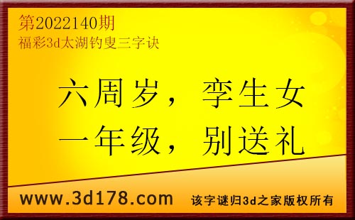 3d第22140期太湖字谜:六周岁,孪生女,一年级,别送礼