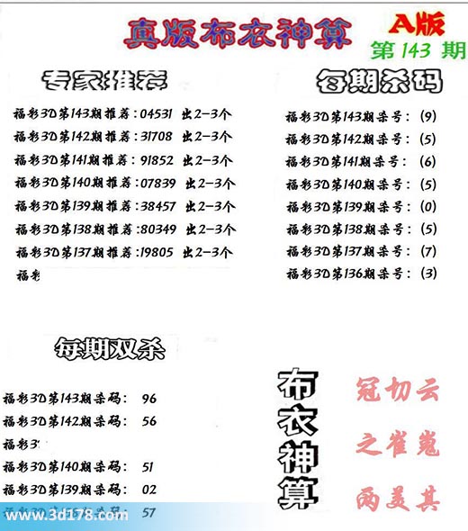 3d布衣神算第143期定位杀码: