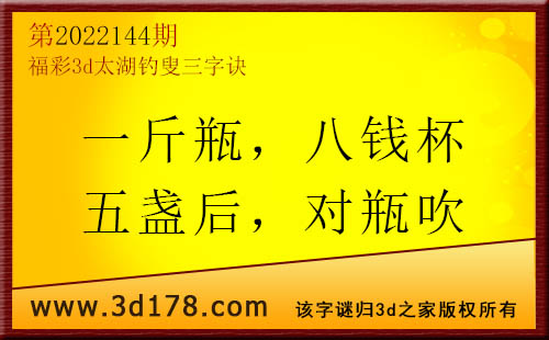3d第2022144期太湖字谜:一斤瓶,八钱杯,五盏后,对瓶吹