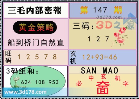 福彩3d第22147期三毛内部密报综合推荐如下:
