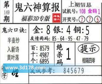 3d第22149期鬼六神算报为您推荐鬼六口诀: