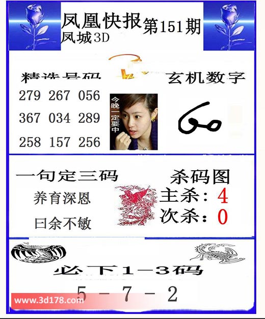 福彩3d凤凰快报图第22151期精选号码推荐: