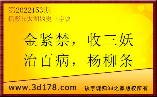 3d第2022153期太湖字谜:金紧禁,收三妖,治百病,杨柳条