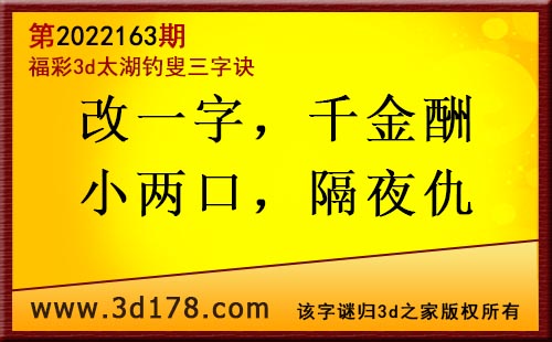 3d第2022163期太湖字谜:改一字,千金酬,小两口,隔夜仇