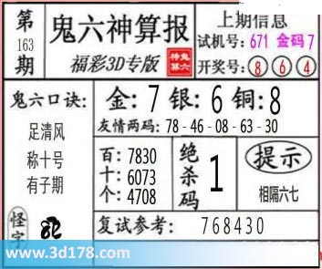 3d第22163期鬼六神算报为您推荐鬼六口诀: