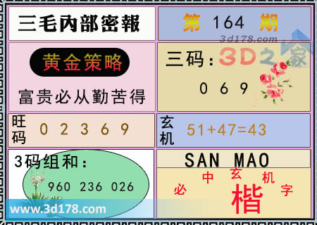 福彩3d第22164期三毛内部密报综合推荐如下:
