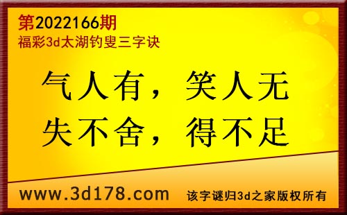 3d第2022166期太湖字谜:气人有,笑人无,失不舍,得不足