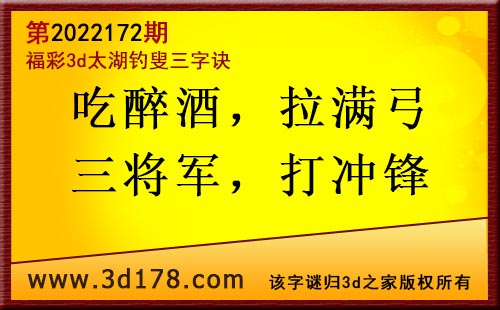 3d第2022172期太湖字谜:吃醉酒,拉满弓,三将军,打冲锋
