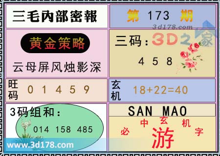 福彩3d第22173期三毛内部密报综合推荐如下: