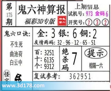 3d第22175期鬼六神算报为您推荐鬼六口诀: