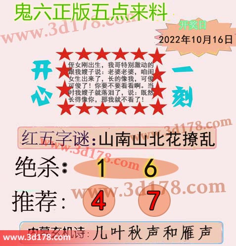 福彩3d第2022275期鬼六五点来料: