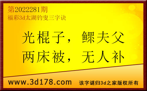 3d第2022281期太湖字谜:光棍子,鳏夫父,两床被,无人补