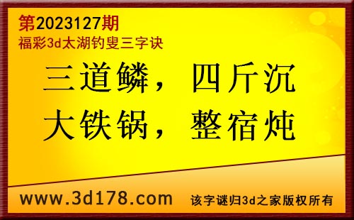 3d第2023127期太湖字谜:三道鳞,四斤沉,大铁锅,整宿炖