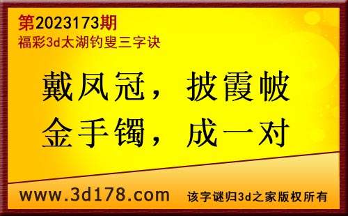 3d第2023173期太湖字谜:戴凤冠,披霞帔,金手镯,成一对