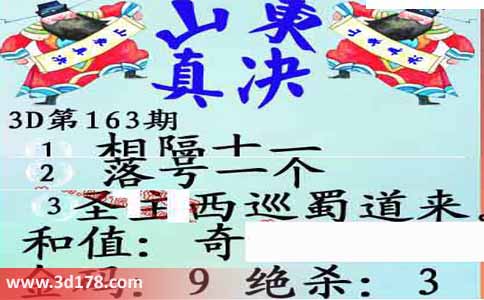 3d第2014163期山东真诀图详解: 1.相隔十一2.落号一个3.圣王西巡蜀道来和值推荐:奇金码推荐:9绝杀:3该丹东图库由3D之家3D图库频道原创,仅供彩民参考,温馨提供。