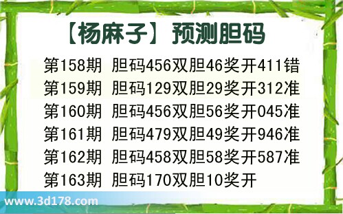 第158期 胆码456双胆46奖开411错第159期 胆码129双胆29奖开312准第160期 胆码456双胆56奖开045准第161期 胆码479双胆49奖开946准第162期 胆码458双胆58奖开587准第163期 胆码170双胆10奖开
