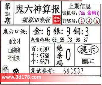 3d第23204期鬼六神算报为您推荐鬼六口诀: