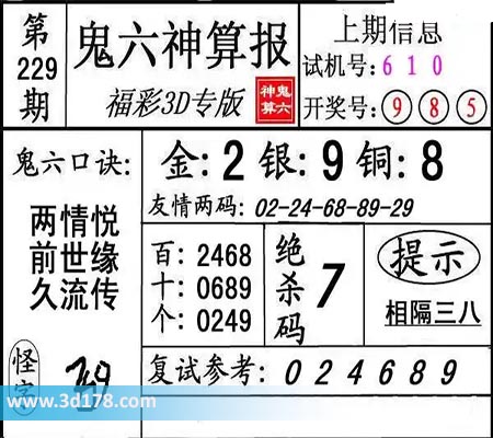 3d第23229期鬼六神算报为您推荐鬼六口诀: