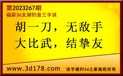 3d第2023267期太湖字谜:胡一刀,无敌手,大比武,结挚友