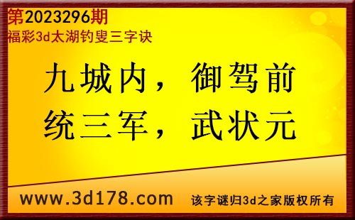 3d第2023296期太湖字谜:九城内,御驾前,统三军,武状元