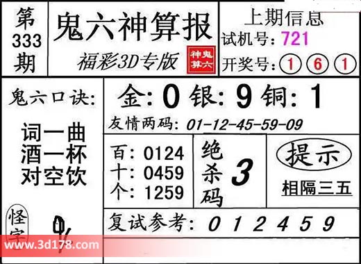 3d第23333期鬼六神算报为您推荐鬼六口诀: