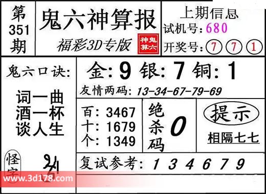 3d第23351期鬼六神算报为您推荐鬼六口诀: