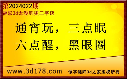 3d第2024022期太湖字谜:通宵玩,三点眠,六点醒,黑眼圈
